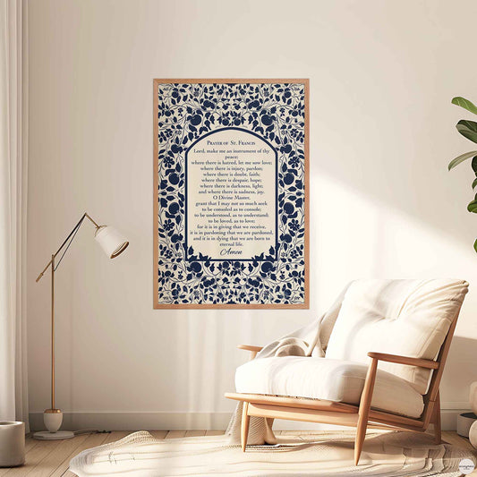St. Francis Prayer Wall Art – Christian Floral Poster in Blue | Spiritual Decor for Home & Office