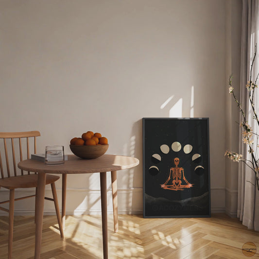 Meditating Skeleton Poster with Moon Phases | Spiritual Wall Art | Celestial Skeleton Print | Mindfulness & Contemplation Decor