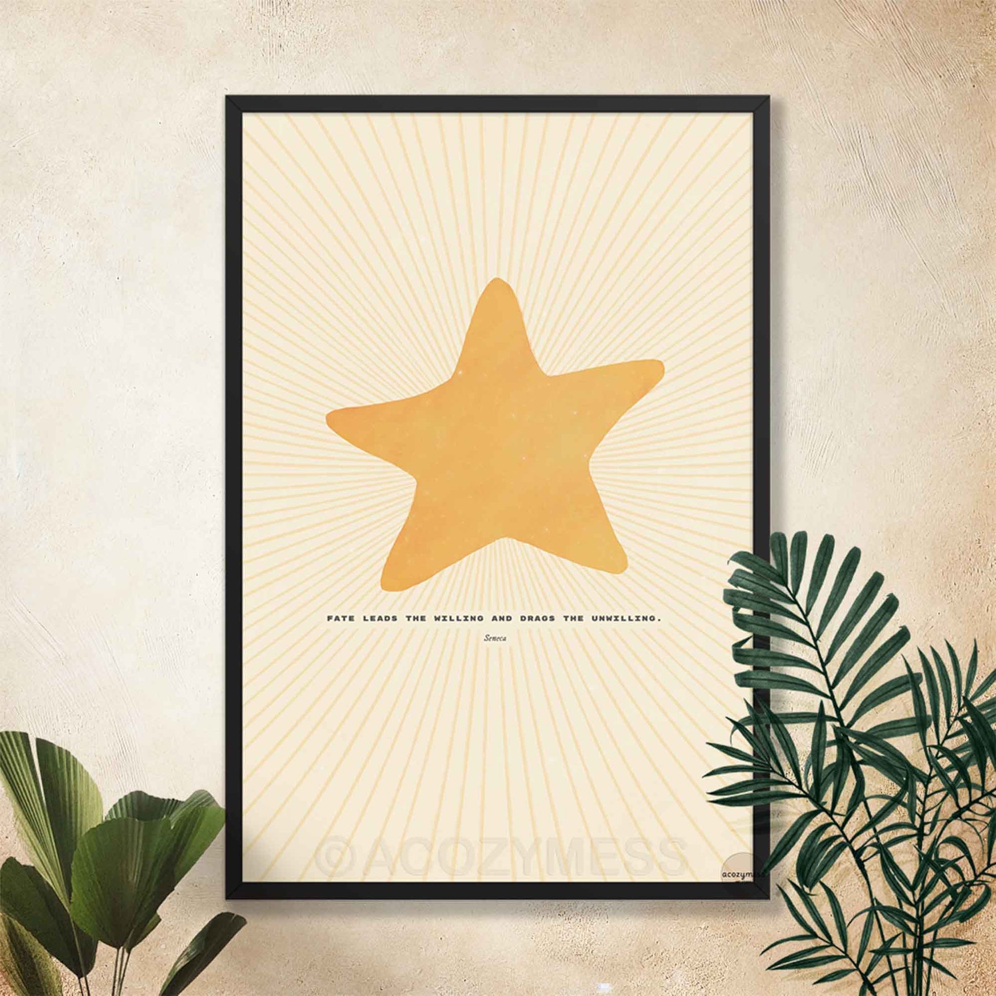 Add timeless Stoic wisdom to your home with this elegant poster featuring Seneca’s enduring words: “Fate leads the willing and drags the unwilling.” The design pair typography on a warm beige background with a radiant star illustration, symbolizing destiny, guidance, and the light of acceptance. This artwork serves as a daily reminder to embrace life’s flow with courage and grace rather than resistance.